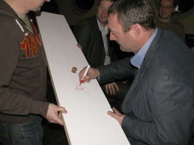 Ron Jans opent nog wat flessen en schiet met een dop een gat in het systeemplafond, maar dat mag de pret niet drukken. Sterker nog: even later voorziet Jans de betreffende plafondplaat van een handtekening en samen met de kurk wordt de plafondplaat weer teruggeplaatst: een prachtig relikwie voor het Home.