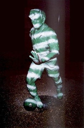 HEERENVEEN - Het standbeeld van de legendarische Friese voetballer Abe Lenstra voor de ingang van het stadion van SC Heerenveen is vrijdag in de groen-witte kleuren van FC Groningen geschilderd. De ludieke actie is hoogstwaarschijnlijk het werk van supporters van FC Groningen. Vrijdag wordt om 20.00 uur de competitiewedstrijd tussen SC Heerenveen en FC Groningen. (bron: RTV Noord teletext, 2 maart 2001)