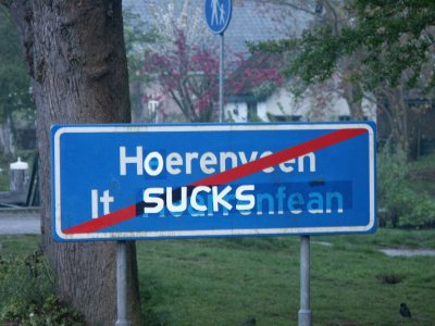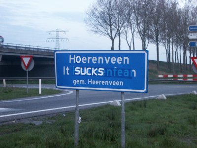 De plaatsnaamborden aan de invalswegen van Heerenveen zijn vannacht onder handen genomen door lieden die zich supporter van FC Groningen noemen. Waar anders 'Heerenveen / It Hearrenfean' staat, staat nu 'Hoerenveen / It sucks'. De Groningers zijn blijkens een persbericht bijzonder trots op wat zij betitelen als "het herstellen van een hinderlijke spelfout".