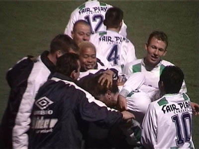 Dejan Curovic heeft net gescoord, en hij wordt gefeliciteerd door zijn ploeggenoten. |