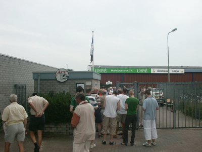 Bij de poort valt het drie kwartier voor de wedstrijd met de drukte nog wel mee. Maar aangezien de wedstrijd dus al om 18.30 uur begint, zullen de meeste mensen op het moment van de foto nog wel achter de aardappelen met jus zitten. |
