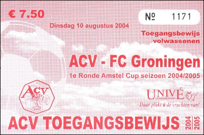 De eerste officiƫle wedstrijd van het seizoen 2004-2005 wordt in Assen gespeeld tegen de amateurs van ACV, een oude club van FC Groningen-trainer Ron Jans. In de eerste helft komt FC Groningen op 0-3 door een fraaie streep in de kruising van Krstev, een kopbal van Van Gessel en een vrije trap van Matthijs. Toch krijgt ACV ook enkele goeie mogelijkheden om te scoren. In de tweede helft zakt het allemaal wat in bij FC Groningen en komt ACV terug tot 1-3. Luirink en Sedoc bepalen uiteindelijk de eindstand. |