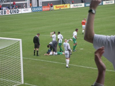 De Nigeriaanse Tuinkabouter ligt kermend op de grond. "Laat maar liggen, laat maar liggen, hij gaat vanzelf wel dood" klinkt het uit het uitvak richting de in Groningen niet zo populaire zakkenvuller. |