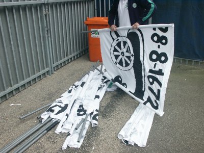 De Tifo-spullen moeten voor de aftrap weer opgeruimd worden. |