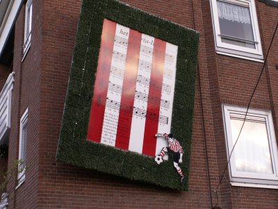 Het Sparta-lied op een groot bord aan een gebouw. |