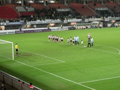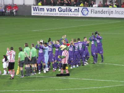 De spelers bedanken de meegereisde supporters in het uitvak. |