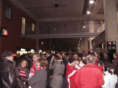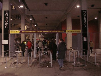 We zitten vandaag in het uitvak op de Oosttribune en lopen door de toegangspoortjes. |