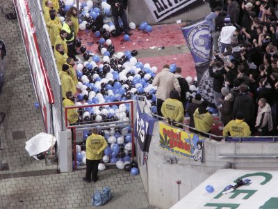 In het uitvak zijn in de rust veel ballonnen opgeblazen. |